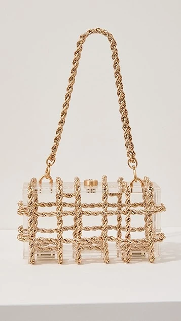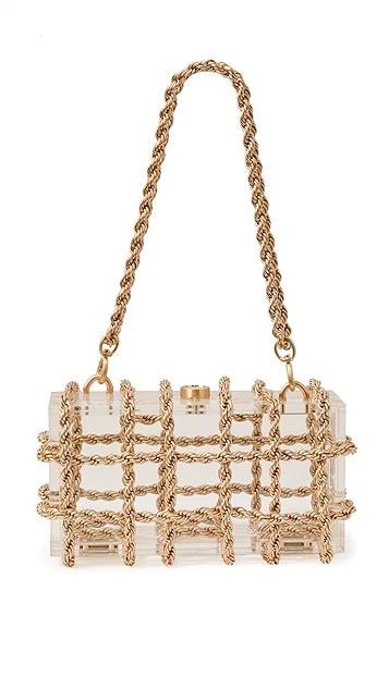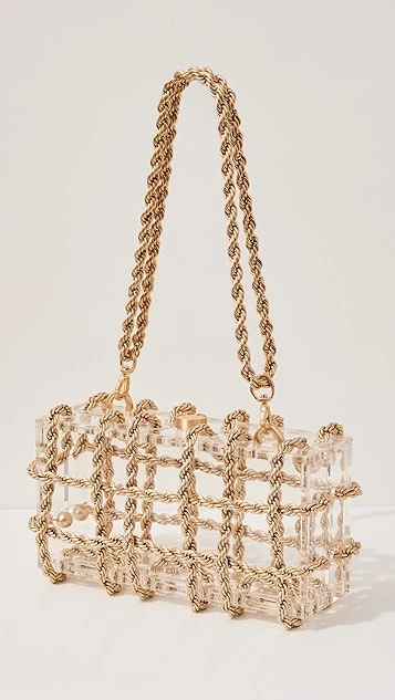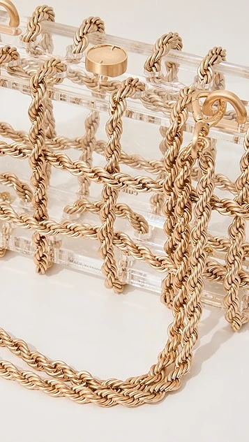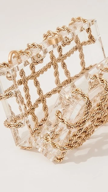 A truly striking and unique take on a classic hardshell clutch. This Cult Gaia shoulder bag is crafted from transparent acrylic, and is covered with a grid-like arrangement of knotted, gold-tone chains.