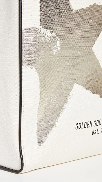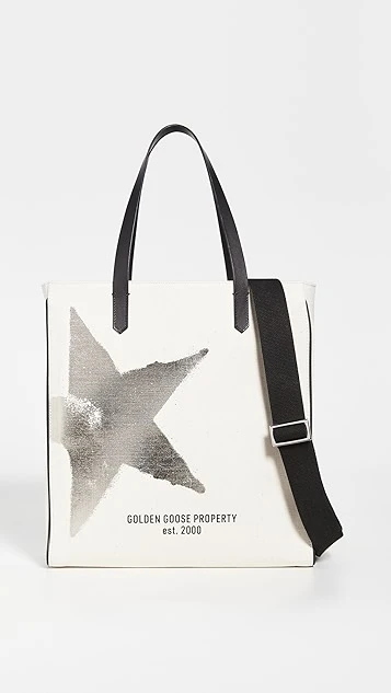 A fresh take on a classic shopper tote from the specialists in bold accessories at Golden Goose. This boxy silhouette is topped with black leather handles, and features a silvery version of the label’s signature star graphic.