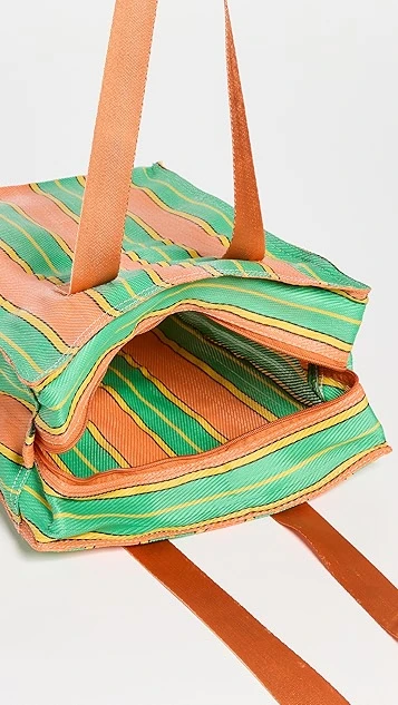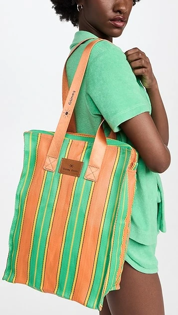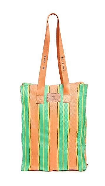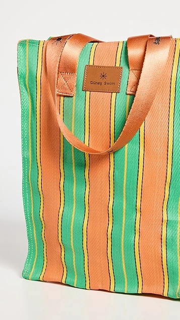 A Gunes canvas tote with space to spare, detailed with a striking mix of multicolor stripes. A top zip secures the top.