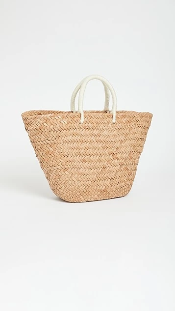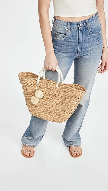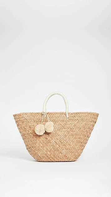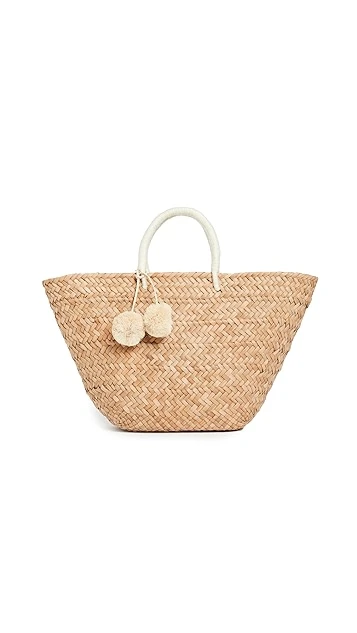 An easygoing accessory with a summery feel, this roomy Kayu straw tote is punctuated by big pom poms and yarn-wrapped handles.