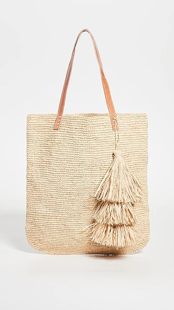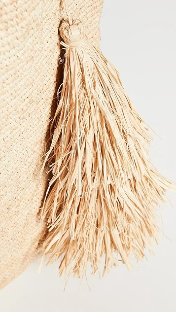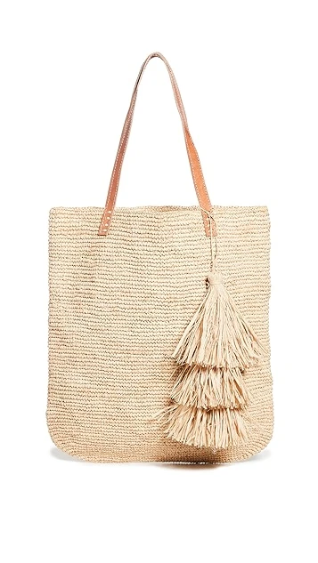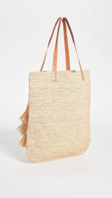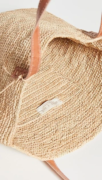A minimalist option for your summer accessories collection, this thin Mar Y Sol straw tote is topped with leather handles and accented with swingy tonal pom poms.