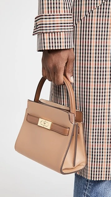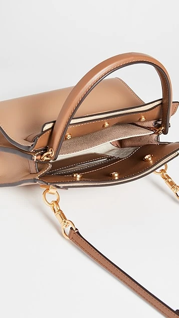A petite version of a sophisticated bag. This two-tone Tory Burch crossbody has a sleek and structured silhouette that shows off the understated logo detailing to advantage.