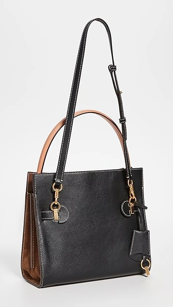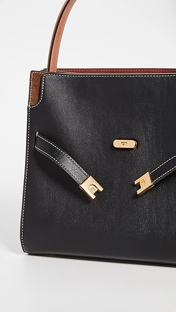 A slightly scaled down version of Tory Burch’s signature, sophisticated Lee Radziwill bag, crafted from subtly texture leather and constructed with brown-suede sides for a subtle touch of contrast.