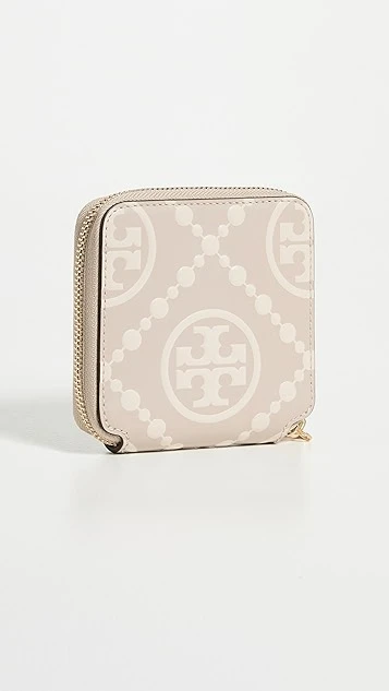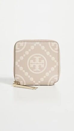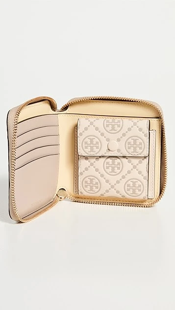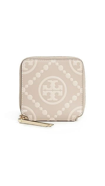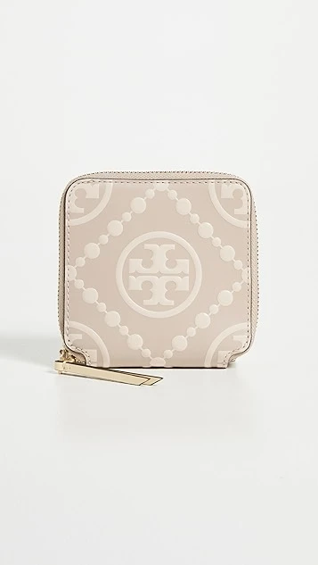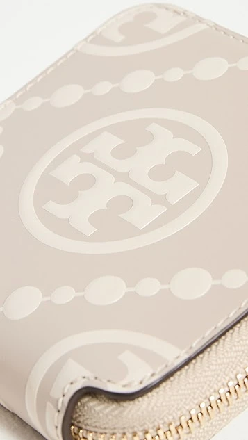 An embossed contrast logo motif adds a signature touch to this compact Tory Burch leather wallet.