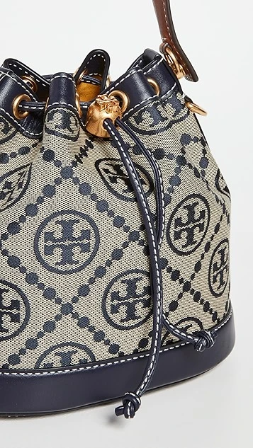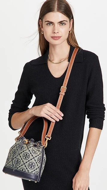 A scaled-down Tory Burch bucket bag, detailed with a rendition of the label’s monogram for a polished and eye-catching look. Two shades of leather trim lend an eclectic finish to the silhouette.