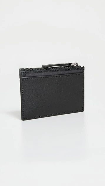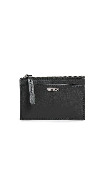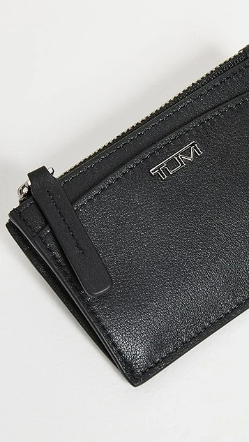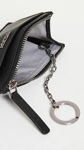 A simple TUMI zip card case in rich leather, outfitted with an included key ring at the lined interior.